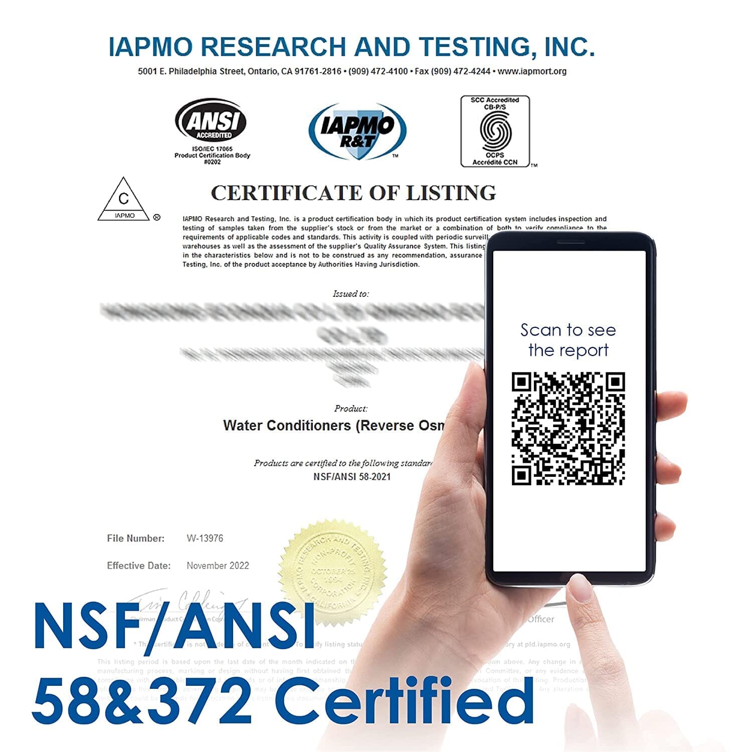 - ✅ Certifications NSF/ANSI 58 & 372 : Assure une réduction efficace des contaminants et des matériaux sans plomb.